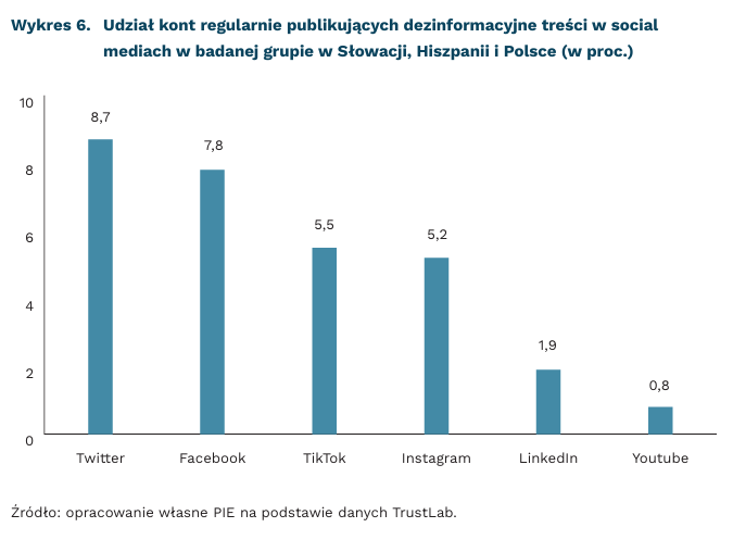 X (Twitter) przekazuje największą liczbę nieprawdziwych informacji. Na portalu znajduje się także najwięcej kont regularnie publikujących dezinformacje. TrustLab wskazuje, że prawie 9 proc. kont z próby regularnie publikuje fake newsy dotyczące wrażliwych treści. Podobne wyniki osiąga Facebook – odsetek wynosi 7,8 proc. Nieco lepiej wypadają TikTok i Instagram – wyniki są zbliżone do 5,0-5,5 proc. Najmniej fałszywych informacji pojawia się w serwisach Youtube i LinkedIn.
