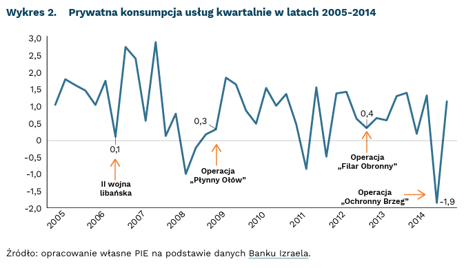 Przez lata Izrael odnotowywał dynamiczny wzrost PKB. Mimo niesprzyjającego położenia geopolitycznego, gospodarka rosła praktycznie nieprzerwanie od 2002 r. (z wyjątkiem okresu pandemii). Wysokie nakłady finansowe na wojsko przyczyniały się do opracowywania nowych technologii, co stymulowało wzrost gospodarczy. Wpływ ataków oraz konfliktów zbrojnych, w których stroną był Izrael stały się przedmiotem wielu analiz starających się oszacować wielopłaszczyznowe skutki występujących napięć.