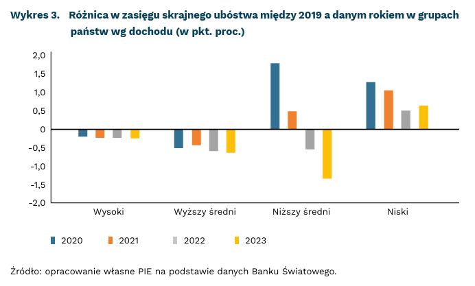 Poprawa obejmuje głównie państwa rozwinięte. W grupie państw o wysokim dochodzie wskaźnik skrajnego ubóstwa w okresie pandemii był stabilny. Nawet przy bardziej restrykcyjnych progach dochodowych Banku Światowego (3,65 USD oraz 6,85 USD), państwa w tej grupie notowały stopniowy spadek skrajnego ubóstwa. Podobnie sytuacja wyglądała w grupie państw o wyższym-średnim dochodzie. W przypadku państwach o niższym-średnim dochodzie pandemia krótkotrwale zwiększyła poziom skrajnego ubóstwa – w 2022 r. było ono mniejsze niż w 2019 r. Najgorzej sytuacja przedstawia się w grupie państw o niskim dochodzie. Poziom skrajnego ubóstwa jest tam nadal wyższy niż przed pandemią. Co więcej, w 2023 r. można spodziewać się dalszego pogorszenia.