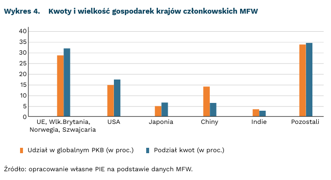Odbywający się w Marrakeszu w dniach 9-15.10.2023 r. szczyt Międzynarodowego Funduszu Walutowego (MFW) odnowił dyskusję na temat podziału głosów w ramach organizacji. Jest ona związana z przeglądem kwot, który ma się zakończyć w grudniu 2023 r. i może doprowadzić do ich zmiany. Wysokość kwot decyduje o tym, ile poszczególne państwa wpłacają do kapitału zakładowego MFW, ile mają głosów oraz jakie limity obowiązują w dostępie do finansowania. System wyznaczania kwot, opierający się na relatywnym potencjale ekonomicznym, otwartości gospodarki, poziomie rezerw walutowych oraz zmienności ekonomicznej, jest krytykowany jako zbyt faworyzujący państwa rozwinięte. Przykładowo, kwoty Chin (6,4 proc.) są mniejsze niż kwoty Japonii (6,5 proc.), pomimo ponad trzykrotnie większego PKB Państwa Środka. Ponadto, system ważenia głosów daje USA możliwość wetowania najważniejszych decyzji.