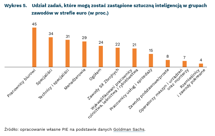 Szacuje się, że w USA jedna czwarta obecnych zadań w pracy mogłaby być zautomatyzowana przez sztuczną inteligencję. Poziom automatyzacji zadań w zawodach może się różnić, przy czym zawody administracyjne (46 proc.) i prawnicze (44 proc.) wykazują wyższy potencjał automatyzacji niż wymagające dużej siły fizycznej, np. budownictwo (6 proc.) czy sprzątanie i konserwacja budynków i terenów (1 proc.). Szacunki dla strefy euro są porównywalne – 24 proc. zadań może zostać zautomatyzowanych przez sztuczną inteligencję (45 proc. w grupie pracowników biurowych wobec 4 proc. rzemieślników). W skali globalnej szacuje się, że 18 proc. zadań wykonywanych w pracy mogłoby zostać zastąpionych przez sztuczną inteligencję. Efekty tych zmian nie będą równomiernie rozłożone, a kraje rozwinięte mogą odczuć je bardziej niż kraje rozwijające się.