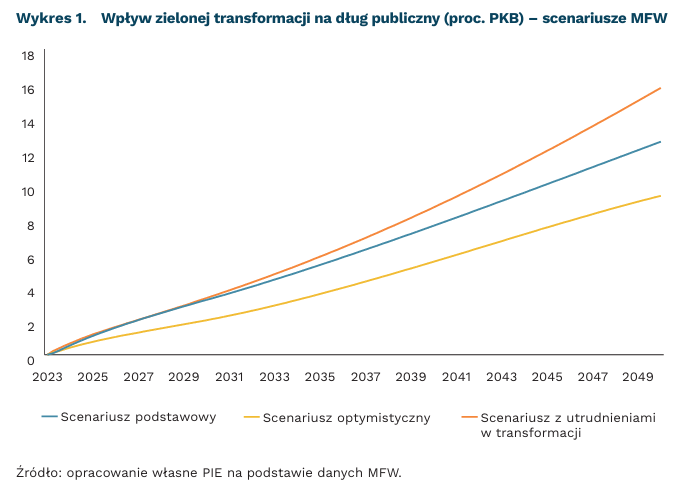 Międzynarodowy Fundusz Walutowy (MFW) prognozuje wzrost światowego długu w relacji do PKB w kolejnych latach. Główne obciążenia poniosą gospodarki rozwinięte oraz Chiny. W dłuższej perspektywie dług będzie nadal rosnąć w związku z kosztami zielonej transformacji. Zaleceniem MFW jest wprowadzanie na całym świecie opłat za emisje CO₂ wraz z mobilizacją innych dochodów. W krajach rozwiniętych w 2030 r. opłaty za emisje powinny wynieść 130 USD/t, a w rozwijających się 45 USD/t. Rządy będą jednocześnie wprowadzać polityki osłonowe dla wrażliwych gospodarstw domowych. Niższe wydatki w sektorze paliw kopalnych częściowo zrównoważą wyższy popyt na kapitał w zielonym sektorze.