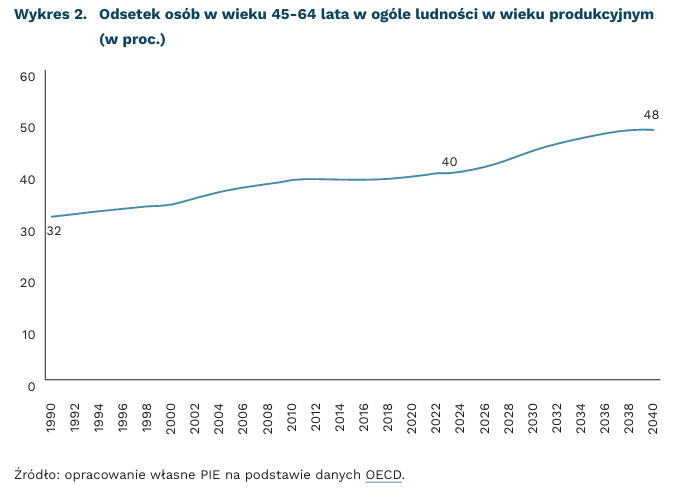 Wraz z postępowaniem procesu starzenia się społeczeństwa zmienia się także struktura wieku grupy produkcyjnej, a więc potencjalnej siły roboczej. W krajach OECD zwiększa się udział osób w wieku 45-64 lata w ogóle ludności w wieku produkcyjnym (15-64 lata). W latach 1990-2023 wzrost ten wyniósł od 28 proc. do około 40 proc. Z danych historycznych oraz prognoz OECD wynika, że trend wzrostowy jest widoczny także w Polsce. W 1990 r. osoby w wieku 45-64 lata stanowiły 31,57 proc. populacji w wieku produkcyjnym. Jak wskazują prognozy, w 2023 r. ten odsetek wyniesie 40 proc., a w 2040 r. – 48,4 proc.