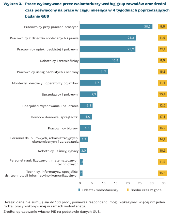 Prawie co trzeci wolontariusz (30,3 proc.) deklarował, że poświęcał swój wolny czas na wykonywanie prac prostych. Natomiast blisko 1/4 wolontariuszy angażowała się w prace wymagające kwalifikacji z dziedzin społeczno-prawnych oraz w podobnej skali świadczona była nieodpłatna praca z zakresu opieki osobistej. Średni czas poświęcany na pracę społeczną przez poszczególne osoby różnił się ze względu na rodzaj wykonywanych czynności. Najbardziej czasochłonne były prace z zakresu opieki osobistej oraz dotyczące pomocy domowej.