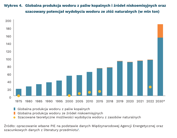 „Złoty wodór” ze złóż naturalnych nie zastąpi konieczności rozwoju jego produkcji ze źródeł odnawialnych, które według Międzynarodowej Agencji Energetycznej powinno do 2030 r. wzrosnąć do 35 mln ton rocznie. To jednak wciąż za mało, aby zaspokoić całkowity globalny popyt na wodór, który do 2030 r. ma wzrosnąć o ponad 60 proc., co wynika z konieczności osiągnięcia neutralności klimatycznej w 2050 r. Zgodnie z tymi przewidywaniami, w 2030 r. blisko 81 proc. wodoru będzie pochodzić z paliw kopalnych. Obecnie produkcja kilograma wodoru z paliw kopalnych oznacza ponad 12 kg emisji CO₂. Niskoemisyjne wydobycie wodoru na poziomie 23 mln ton H₂ pozwoliłoby tym samym ograniczyć emisje związane z jego produkcją nawet o 276 mln ton CO₂ rocznie (ok. 70 proc. emisji polskiej gospodarki).