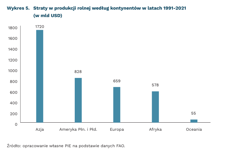 Światowe straty rolnictwa wyniosły 3,8 bln USD w ostatnich 30 latach. Średnio w ciągu roku było to 123 mld USD. Tendencja jest jednak rosnąca, a wzrost dotyczy pięciu głównych kategorii produktów rolniczych: zbóż, owoców i warzyw, mięsa i nabiału. Najmocniej cierpi Azja. Ten rejon świata poniósł 45 proc. globalnych strat w latach 1991-2021. Odpowiada to kwocie 1720 mld USD. Rolnictwo w obu Amerykach doznało szkód o wartości 828 mld USD, co odpowiada za 22 proc. światowych zniszczeń. Europa i Afryka utraciły odpowiednio 659 mld USD (17 proc.) i 578 mld USD (15 proc.). Pod względem relacji strat do PKB najmocniej dotknięta została Afryka – niemal 4 proc.