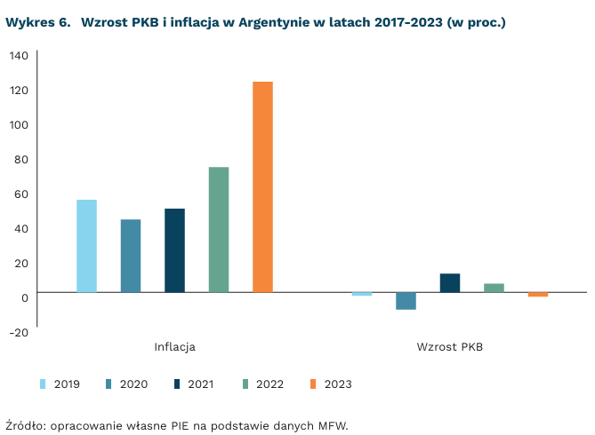 Sytuacja gospodarcza w Argentynie uległa pogorszeniu w 2023 r. – PKB zmniejszy się o 2,5 proc., a inflacja, według szacunków MFW, wyniesie 121,7 proc. Jest to najwyższy wskaźnik inflacji od 1991 r. Największy spadek aktywności gospodarczej zanotowano w sektorze rolnym (-40,2 proc. r/r za II kwartał br.), spowodowany m.in. wyjątkową suszą, nie notowaną od ok. 60 lat. Straty w eksporcie produktów rolnych wynoszą ok. 20 mld USD w porównaniu z 2022 r.