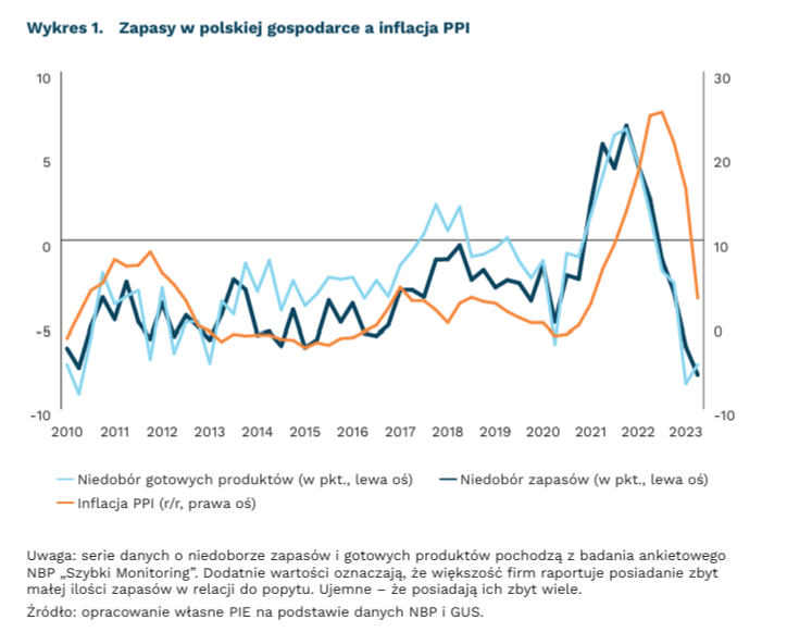 Dane po rewizjach wskazują na wciąż istotną, ale znacznie mniejszą rolę zapasów w tegorocznym wzroście. Na podobny trend wskazuje także badanie NBP „Szybki Monitoring”. Firmy akumulowały zapasy oczekując przedłużenia okresu dobrej koniunktury gospodarczej w 2022 r. Wybuch wojny w Ukrainie doprowadził jednak do osłabienia fundamentów gospodarczych w Europie. W konsekwencji rekordowo dużo przedsiębiorstw zostało ze zbyt dużą liczbą gotowych produktów w relacji do słabnącego popytu. W naturalny sposób osłabiało to bieżącą produkcję w przemyśle oraz doprowadziło do wyhamowania wzrostu cen – wskaźnik PPI wpadł w deflację.