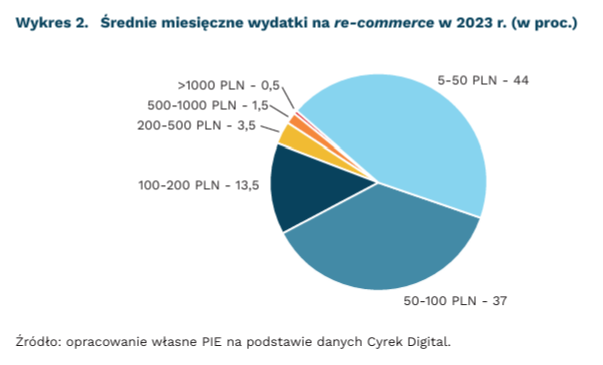 W Polsce w I połowie 2023 r. wśród 111 mln opublikowanych ogłoszeń na platformie OLX aż 68 proc. dotyczyło rzeczy używanych. Wśród kategorii z największym udziałem ogłoszeń rzeczy używanych znalazły się: muzyka i edukacja (81 proc.), elektronika (79 proc.) oraz sport i hobby (79 proc.). Za 59 proc. re-commerce odpowiada sprzedaż w internecie, jednak wyłącznie offline zakupy robi jedynie 9 proc. Polaków (pozostali kupowali offline i online). Najpopularniejszymi serwisami wśród kupujących okazały się Vinted (76 proc. wskazań) oraz OLX (58 proc. wskazań). Średnio miesięcznie Polacy wydają na produkty używane raczej niewielkie kwoty. Dane wskazują, że 44 proc. respondentów wydaje od 5 PLN do 50 PLN, a 37 proc. od 50 PLN do 100 PLN.