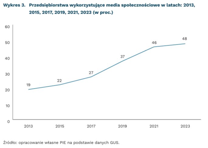 W 2023 r. już blisko połowa (48 proc.) firm wykorzystywała media społecznościowe w celach biznesowych. Jeszcze dekadę temu było to 19 proc. Ponad 80 proc. dużych przedsiębiorstw wykorzystywało media społecznościowe w celu tworzenia wizerunku lub marketingu produktów (76 proc.) oraz do rekrutacji pracowników (58 proc.). Social media służą jednak nie tylko do budowania własnej marki i jako kanał komunikacji z klientami, ale także do prowadzenia sprzedaży. Z komunikatu PARP z sierpnia 2022 r. wynika, że rośnie popularność social commerce, czyli handlu prowadzonego bezpośrednio przez portale społecznościowe lub z minimalnym udziałem witryny sklepu internetowego, do którego media społecznościowe przekierowują.