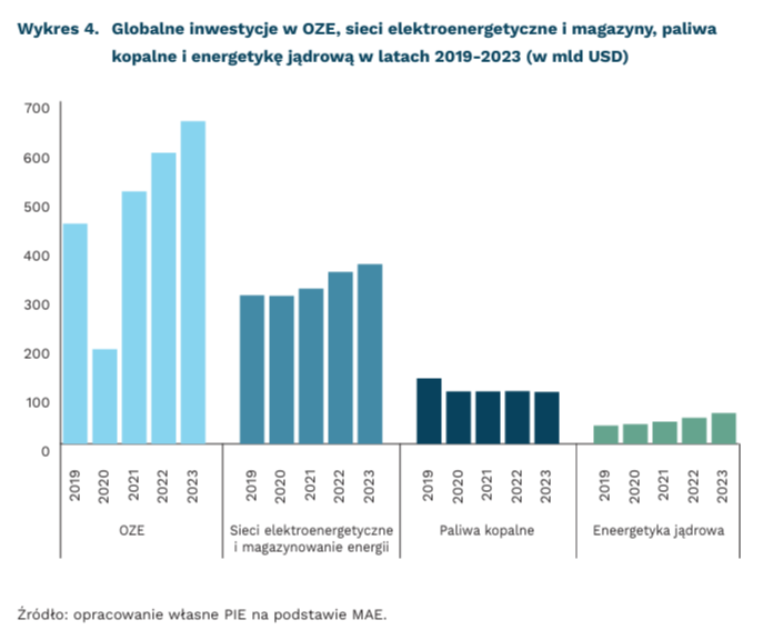 Według MAE, globalne inwestycje w sieci elektroenergetyczne i magazyny energii w 2023 r. wyniosły 368 mld USD i były 2,5 razy większe niż w sektorze paliw kopalnych. W latach 2019-2023 nakłady finansowe na sieci elektroenergetyczne i magazyny wzrosły o 21 proc., podczas gdy inwestycje w OZE o 46 proc., do 659 mld USD w 2023 r., co implikuje potrzebę dalszego finansowania nowych sieci elektroenergetycznych. Według Bloomberg New Energy Finance, dla osiągnięcia celów klimatycznych do 2050 r. na sieci należałoby wydać 21,4 bln USD, z czego 4,1 bln USD na utrzymanie istniejącej infrastruktury, a pozostałe 17,3 bln USD na budowę nowej. Według Eurelectric, aby osiągnąć unijne cele transformacji, średnie roczne inwestycje w europejskie sieci elektroenergetyczne od teraz do 2050 r. muszą być co najmniej o 84 proc. wyższe niż w 2021 r.