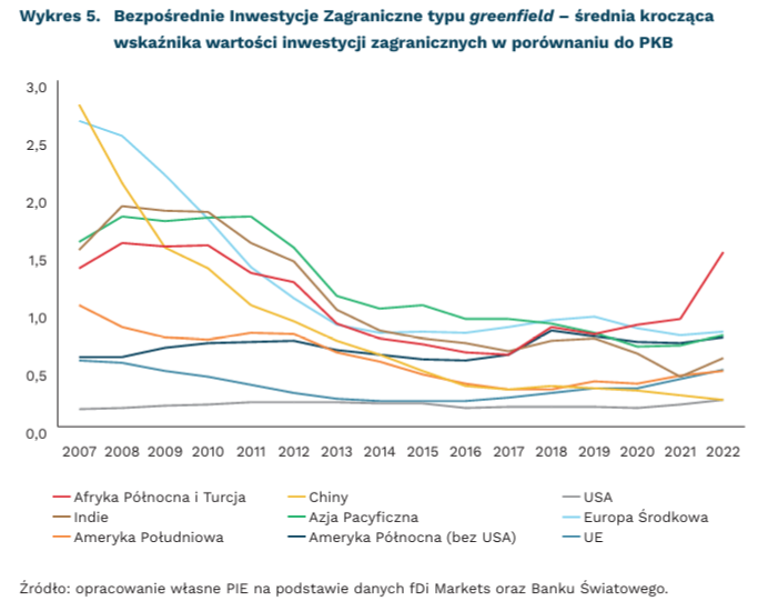 W porównaniu do PKB dynamika tych zmian jest niejednoznaczna dla Europy Środkowej. Napływ zagranicznych inwestycji greenfield w stosunku do PKB był na wyższym poziomie w ostatnich 5 latach niż m.in. w UE, USA, Azji Pacyficznej czy Kanadzie i Meksyku. Jednocześnie ten napływ był o połowę niższy niż w Afryce Północnej i Turcji. Chiny oraz EŚ odnotowały ponad dwukrotne załamanie w stosunku do okresu 2003-2007[3]. Porównując lata po pandemii 2021-2022 do 2018-2019 EŚ odnotowała niższy napływ inwestycji greenfield (ważonych przez PKB) niż Europa Zachodnia, USA, Ameryka Płd. czy wybrane państwa Azji Pacyficznej (bez Indii i Chin).