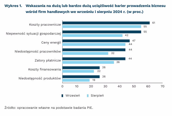 Firmy handlowe we wrześniu silniej odczuwały utrudnianie barier prowadzenia działalności niż miesiąc wcześniej. Największy wzrost (o 13 pkt. proc.) zaniepokojonych przedsiębiorstw dotyczył niepewności sytuacji gospodarczej. Ponad połowa (55 proc.) firm handlowych wskazuje na tę barierę. Wzrósł również odsetek przedsiębiorstw (z 55 proc. do 61 proc.) skarżących się na koszty pracownicze – obecnie najbardziej uciążliwą barierę nie tylko w firmach handlowych. Blisko połowa firm handlowych (47 proc.) dostrzega duże utrudnienia z powodu rosnących cen energii, ale podobna część firm handlowych (44 proc.) wskazywała na ten problem również w sierpniu.