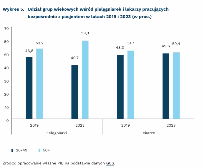 Wzrósł udział grupy w wieku 50+ wśród osób pracujących w zawodzie pielęgniarki. W 2023 r. 59 proc. wszystkich pielęgniarek pracujących bezpośrednio z pacjentami miało 50 lat lub więcej. To wzrost o 6 pkt. proc. podczas czterech lat – w 2019 r. było to 53 proc. W liczbach bezwzględnych ta grupa wiekowa zwiększyła się ze 114 tys. pracowników do 128 tys. Zgoła inne przemiany w strukturze wiekowej można zaobserwować w zawodzie lekarzy, w którym udział pracujących osób powyżej 50. r.ż. zmniejszył się z niecałych 52 proc. do 50,4 proc.