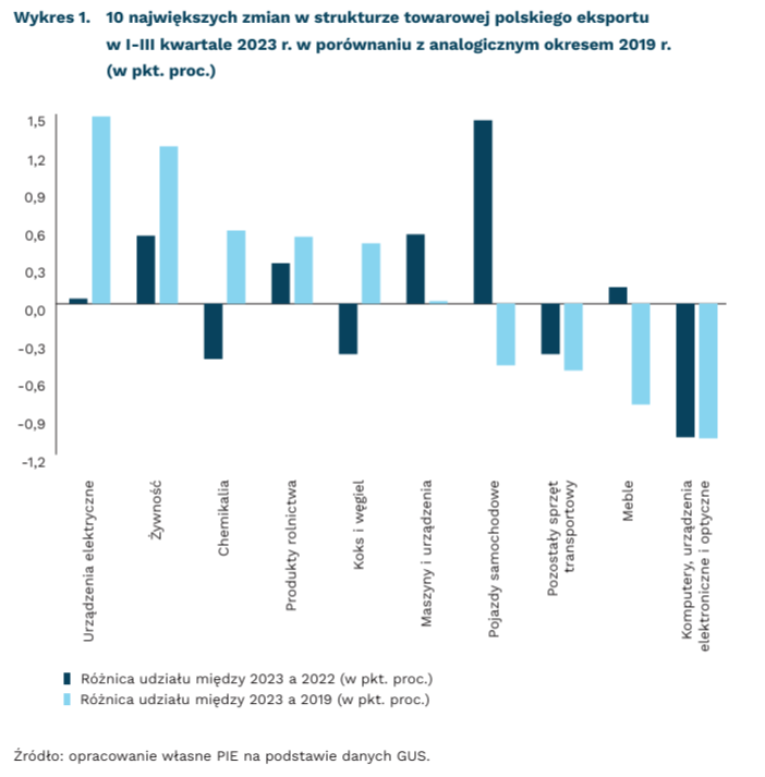 Z kolei najważniejsza grupa towarowa w polskim eksporcie – pojazdy samochodowe – wciąż odbija się po pandemii. Ta grupa odnotowała najwyższy wzrost r/r, ale udział tej kategorii w porównaniu z 2019 r. spadł o 0,5 pkt. proc. Największy spadek w ujęciu 5-letnim odnotowano w grupach: komputery, wyroby elektroniczne i optyczne (o 1 pkt. proc. do 7 proc.) oraz meble (o 0,8 pkt. proc. do niecałych 4 proc.).