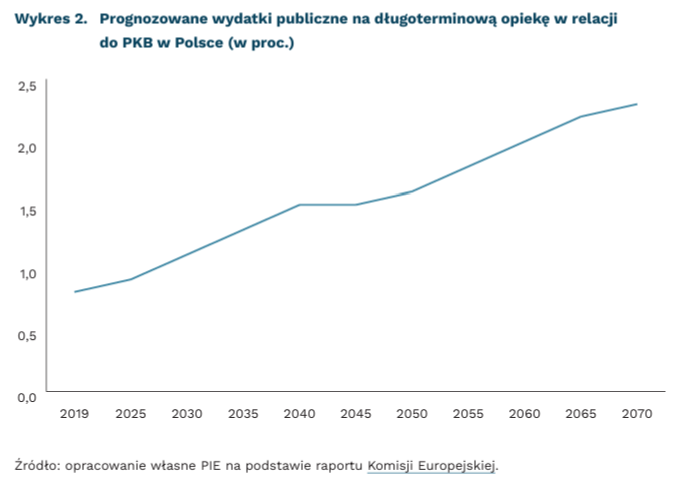 Komisja Europejska prognozuje, że wydatki na formalne usługi opieki długoterminowej będą wzrastać w całej Unii Europejskiej. W raporcie Komisji Europejskiej z 2021 r. przedstawiono kilka prognoz przyszłych wydatków publicznych na długoterminową opiekę w relacji do PKB. „Scenariusz demograficzny” skupia się na wpływie procesu starzenia się społeczeństwa na wydatki publiczne związane z opieką długoterminową. Według tej prognozy, w Polsce wskaźnik wzrośnie o 196 proc. w latach 2019-2070 – z 0,8 proc. do 2,3 proc. PKB.