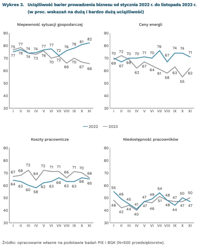Niepewność sytuacji gospodarczej jest barierą najsilniej utrudniającą działanie firm, choć jej uciążliwość systematycznie słabnie. Na niepewność sytuacji gospodarczej firmy skarżyły się szczególnie w II połowie 2022 r. (ponad 80 proc. wskazywało na silną lub bardzo silną uciążliwość tej bariery). Pod koniec 2023 r. przedsiębiorcy nadal narzekają na niepewność sytuacji gospodarczej, ale odsetek wskazujących na jej silną uciążliwość spada i w listopadzie 2023 r. wyniósł 66 proc. (spadek o 6 pkt. proc. r/r).