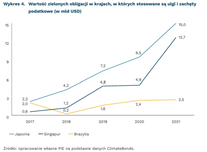 Rynek zielonych obligacji rozwija się najszybciej w krajach, w których istnieją zachęty fiskalne wspierające rozwój tego typu instrumentów. Jednym ze sposobów są ulgi podatkowe dla inwestorów zielonych obligacji. Takie rozwiązania stosowane są m.in. w Stanach Zjednoczonych (federalne ulgi dla pożyczkobiorców) czy w Brazylii, w której osoby fizyczne zamieszkujące ten kraj nie płacą podatków z dochodów z zielonych obligacji, a osoby prawne płacą zaledwie 15-proc. podatek. Innym rozwiązaniem są programy grantowe, rozwijane głównie w krajach azjatyckich, jak Singapur, Japonia czy Malezja. Jak wynika z danych ClimateBonds, zachęty dla inwestorów w danych krajach mogły przyczynić się do zwiększenia wartości zielonych obligacji w latach 2017-2021.