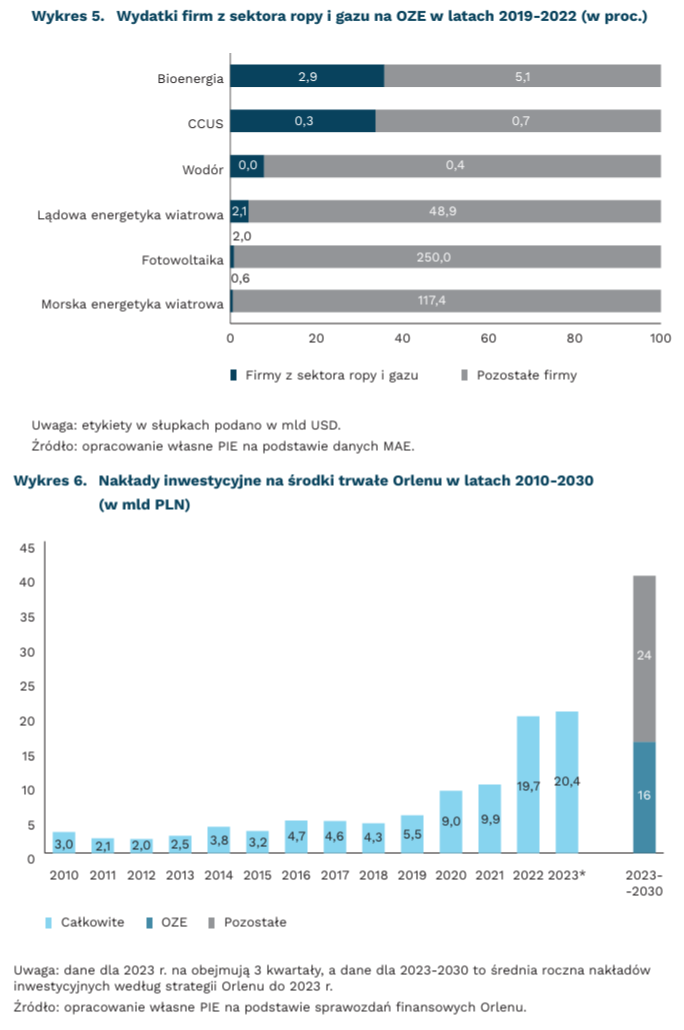 Polski koncern Orlen planuje zainwestować do końca dekady ponad 320 mld PLN, z czego ok. 120 mld PLN (ok. 40 proc.) w zielone inwestycje – wynika ze zaktualizowanej strategii Grupy Orlen do 2030 r. Nakłady inwestycyjne na środki trwałe wzrosły w latach 2021-2022 blisko dwukrotnie do 19,7 mld PLN. W pierwszych trzech kwartałach 2023 r. przekroczyły już 20 mld PLN. Natomiast średnie nakłady do 2030 r. mają sięgać nawet 40 mld PLN rocznie. Koncern planuje inwestycje w obszarze morskiej i lądowej energetyki wiatrowej, fotowoltaiki, bioenergii, elektromobilności czy zielonego wodoru, co odpowiada na wyzwania wskazane przez MAE.