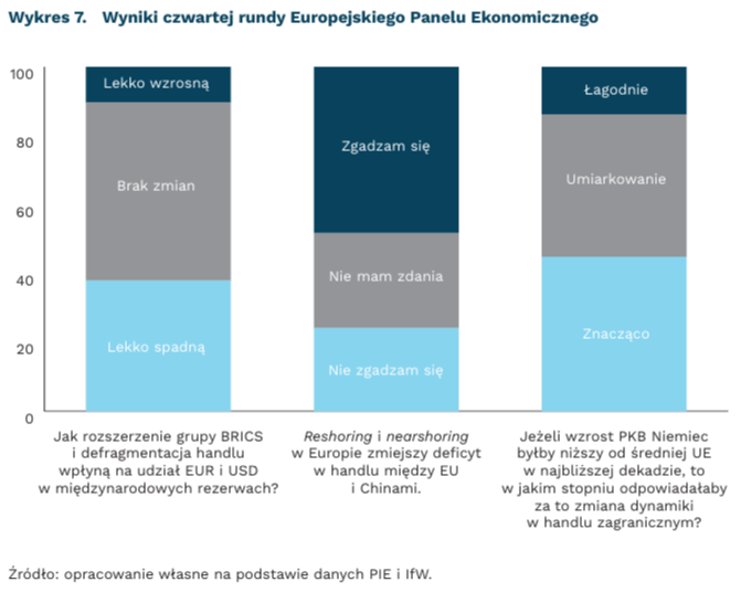 Ponowne przenoszenie fabryk do Europy ułatwi zmniejszenie zależności handlowej od Chin. Ekonomiści są jednak w tej sprawie podzieleni. Połowa panelistów zgadza się, że reshoring i nearshoring zredukują deficyt handlowy między Unią Europejską a Państwem Środka. Pozostali nie zgadzają się (24 proc) albo nie mają zdania (28 proc.). Ekonomiści nastawieni sceptycznie do tej idei wskazują na niepewność związaną ze skalą odejścia od handlu z Chinami. Według nich, ten proces może być powolny m.in. ze względu na konkurencyjność kosztową Chin.