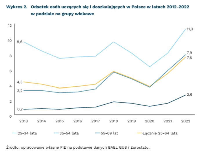 7,6 proc. osób w wieku 25-64 lata w 2022 r. deklarowało uczenie się formalne (w szkole i na studiach wyższych) lub dokształcanie się (na kursach czy szkoleniach) w okresie czterech tygodni przed badaniem. To o 1,9 pkt. proc. więcej niż w 2018 r., ale o 4,3 pkt. proc. mniej, niż wynosi średnia dla krajów UE. W krajach skandynawskich odsetek ten wyniósł ponad 20 proc. (Eurostat). Jednocześnie odsetek kształcących się osób dorosłych w Polsce wzrósł w ostatniej dekadzie w każdej kategorii wiekowej, choć trudno mówić o wyraźnym trendzie.