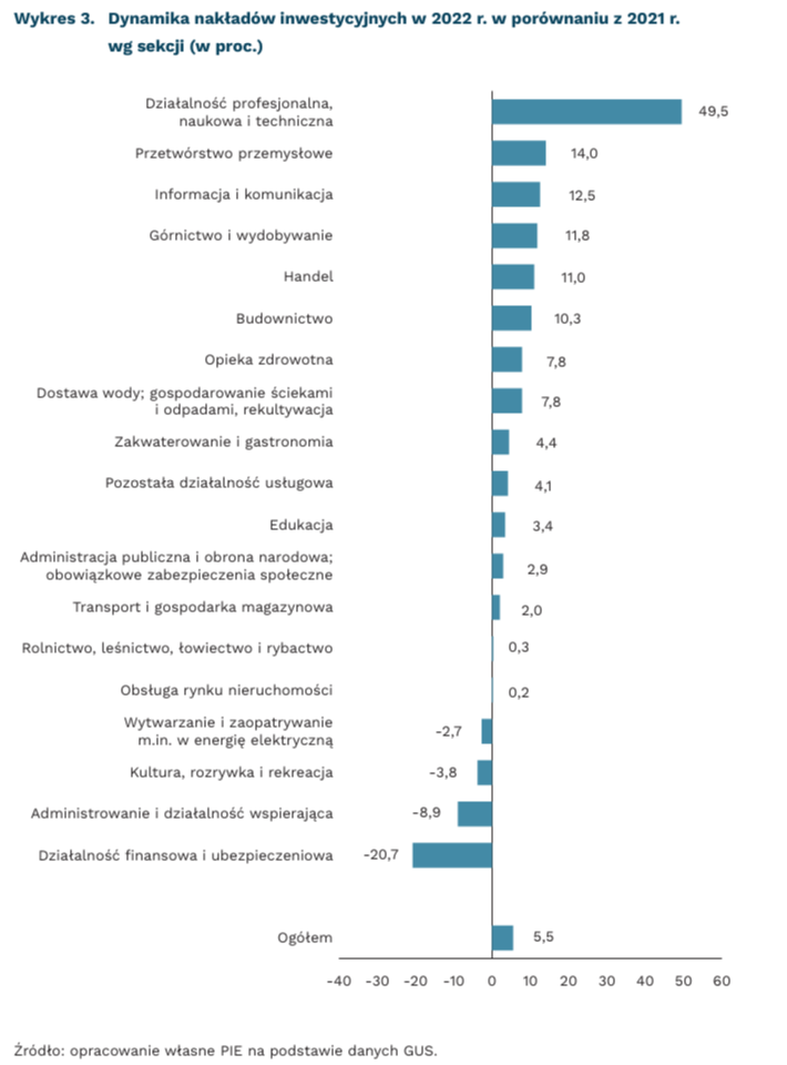 W 2022 r. zaobserwowano wzrost r/r dynamiki nakładów inwestycyjnych w zdecydowanej większości sekcji gospodarki. Wydatki inwestycyjne (w cenach stałych) najbardziej wzrosły dla działalności profesjonalnej, naukowej i technicznej (wzrost r/r o 49,5 proc.), w przetwórstwie przemysłowym (14 proc.) oraz w informacji i komunikacji (13 proc.). Natomiast spadek r/r wydatków ponoszonych na inwestycje odnotowały sekcje: Działalność finansowa i ubezpieczeniowa (o 20,7 proc.), Administrowanie i działalność wspierająca (o 8,9 proc.), Kultura, rozrywka i rekreacja (o 3,8 proc.).