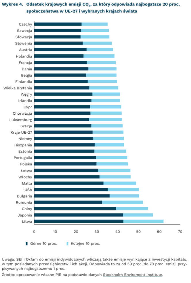 Wysokie pozostają także nierówności emisji CO₂ wewnątrz poszczególnych krajów, również tych rozwiniętych. Wśród krajow UE największe nierówności widoczne są na Litwie (najbogatsze 20 proc. społeczeństwa odpowiada za 62 proc. emisji), w Rumunii (52 proc.) i Bułgarii (50 proc.). Najniższymi nierównościami emisji charakteryzują się Czechy (35 proc), Szwecja i Słowacja (po 36 proc.). Polska, w której najbogatsze 20 proc. społeczeństwa odpowiadało w 2019 r. za 45 proc. emisji, znajduje się powyżej średniej dla krajów UE (42 proc).