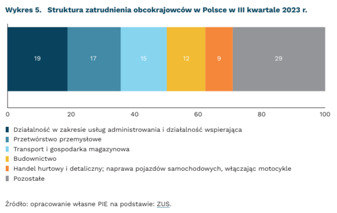 Struktura pracujących w Polsce cudzoziemców pozostaje stabilna. Na koniec III kw. 2023 r. 68 proc. obcokrajowców pracujących w Polsce stanowili Ukraińcy, 11 proc. – Białorusini, zaś 2 proc. – Gruzini. Największa grupa, czyli niemal co piąty zatrudniony znalazł pracę w administracji. Kolejne sektory zatrudniające obcokrajowców w Polsce to przetwórstwo przemysłowe (17 proc. pracujących) oraz transport i magazynowanie (15 proc.).