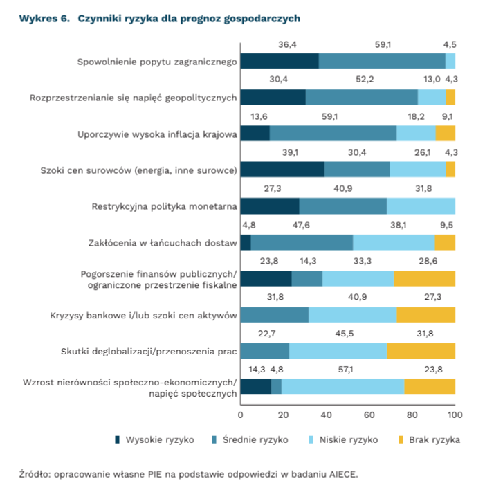 Spowolnienie popytu zagranicznego oraz napięcia geopolityczne stanowią główne czynniki ryzyka wpływające na prognozy. Prawie 95 proc. ekspertów AIECE ocenia ryzyko spowolnienia popytu zagranicznego jako wysokie lub średnie. Napięcia geopolityczne są postrzegane jako istotne przez 85 proc. respondentów. Mimo spowolnienia gospodarczego, eksperci nadal obawiają się wzrostu inflacji. Prawie 40 proc. uczestników badania wskazało, że zmiany cen surowców obarczone są wysokim ryzykiem. Na poziomie krajowym ponad 70 proc. respondentów zauważa znaczące ryzyko wzrostu inflacji, przy równie dużym odsetku obaw związanych z restrykcyjną polityką monetarną.