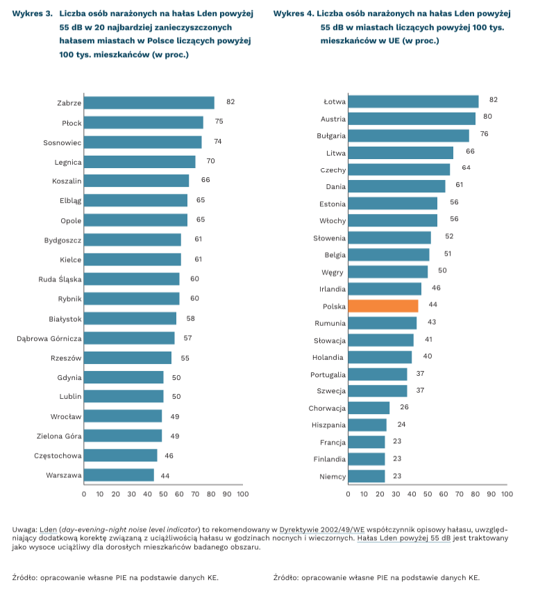 Aż o 11 pkt. proc. mogą rozminąć się kraje UE z przyjętymi celami związanymi z redukcją hałasu komunikacyjnego w UE. W Komunikacie „Plan działania UE na rzecz elimanacji zanieczyszczeń wody, powietrza, gleby” z 2021 r., w celu minimalizacji zanieczyszczeń hałasem, określono cel szczegółowy polegający na ograniczeniu do 2030 r. udziału osób długotrwale narażonych na hałas komunikacyjny o 30 proc. w stosunku do poziomu z 2017 r. Spełnienie tego celu może okazać się problematyczne. Według szacunków KE, do 2030 r. wartość ta zmniejszy się tylko o 19 proc., o ile nie zostaną wprowadzone dodatkowe rozwiązania na poziomach krajowym, regionalnym i lokalnym.