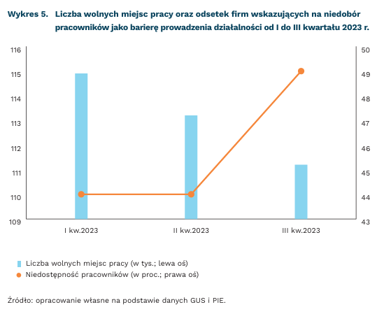 Zmniejszającej się w 2023 r. liczbie wolnych miejsc pracy towarzyszy wciąż duży (około 50-proc.) udział przedsiębiorców wskazujących na niedostępność pracowników jako bariery utrudniającej prowadzenie działalności. Z badania Miesięcznego Indeksu Koniunktury (MIK) wynika, że w ostatnich miesiącach 2023 r. udział ten nawet przekracza 50 proc. Pracodawcy wciąż poszukują pracowników, w szczególności pracowników wykwalifikowanych i o odpowiednich kompetencjach. Przy niskiej stopie bezrobocia zakres poszukiwań jest ograniczony, a firmy konkurują między sobą w rekrutacji pracowników.