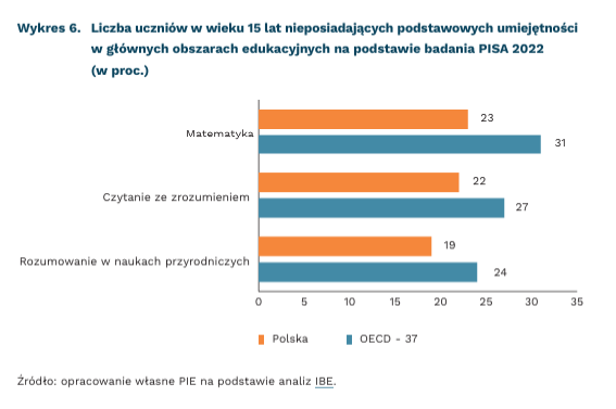 Spadek ogólnych wyników oraz wzrost liczby uczniów nieposiadających podstawowych umiejętności nastąpił w większości państw objętych badaniem. Największe spadki wyników dotyczyły matematyki. W Polsce liczba uczniów, która nie osiągnęła z tego obszaru tzw. poziomu 2 (poniżej tego poziomu uznaje się, że uczeń nie posiada podstawowych umiejętności) wzrosła z 15 proc. w 2018 r. do 23 proc. w 2022 r. Dla rozumienia czytanego tekstu i rozumowania w naukach przyrodniczych wzrost liczby uczniów wyniósł odpowiednio z 15 proc. do 22 proc. oraz z 14 proc. do 19 proc. Należy zauważyć, że mimo iż znacząco wzrósł odsetek słabych wyników, to liczba uczniów z najsłabszymi wynikami Polsce jest wyraźnie mniejsza niż ich przeciętna liczba w krajach OECD.