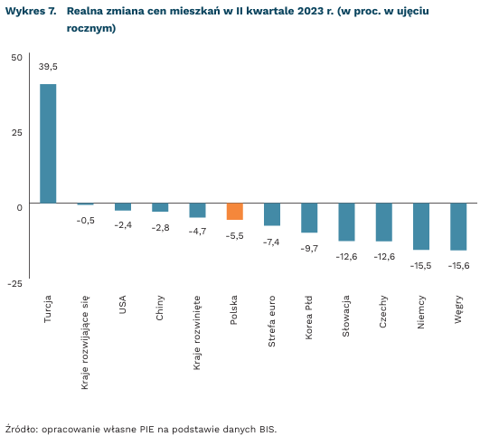 W innych krajach zmiany cen nieruchomości także różnią się znacząco. Ma to związek chociażby z poziomem stóp procentowych oraz ze strukturą rynku. Chociaż w II kwartale ceny nieruchomości spadały w gospodarkach rozwiniętych (-4,7 proc. w ujęciu r/r.), to np. spadek w Niemczech (-15,5 proc.) był dużo wyższy niż w Stanach Zjednoczonych (-2,4 proc.). Ma to związek nie tylko z inflacją, bowiem w Niemczech ceny nieruchomości spadały też w ujęciu nominalnym. Z kolei w gospodarkach wschodzących średnie ceny pozostały niemal niezmienione (-0,5 proc.), to jednak np. w Turcji w II kwartale ceny nieruchomości wzrastały o 40 proc. w ujęciu rocznym, ale w Korei spadały już o 10 proc. w ujęciu rocznym.