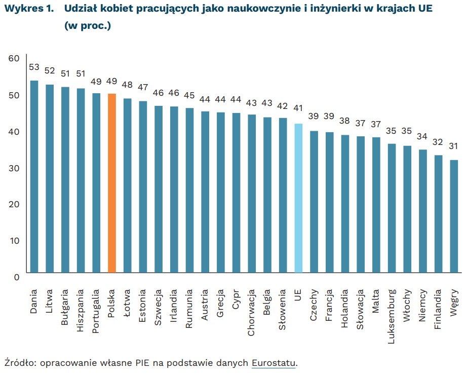 W 2022 r. w Polsce było 690 tys. naukowczyń i inżynierek, czyli o 36 tys. więcej niż rok wcześniej – wynika z danych Eurostatu. Stanowiły one 49 proc. wszystkich naukowców i inżynierów. W całej UE w 2022 r. było 7,3 mln naukowczyń i inżynierek, czyli ok. 310 tys. więcej niż rok wcześniej i stanowiły one 41 proc. wszystkich naukowców i inżynierów. Największy udział kobiet pracujących jako naukowcy lub inżynierowie zanotowano w: Danii (53 proc.), na Litwie (52 proc.), w Bułgarii (51 proc.) i Hiszpanii (51 proc.), co oznacza, że wynik Polski jest tuż za europejską czołówką. Najmniej sfeminizowane jest środowisko naukowe na Węgrzech (31 proc.), w Finlandii (32 proc.) i Niemczech (34 proc.).