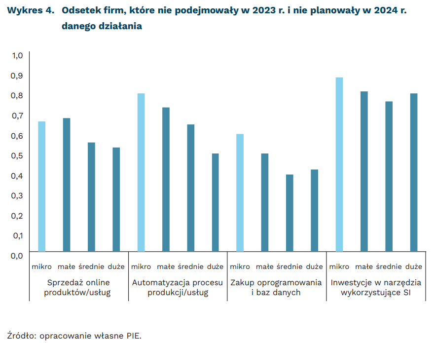 Z badań prowadzonych przez PIE wynika, że aż 87 proc. mikroprzedsiębiorstw nie korzysta i nie planuje korzystać z rozwiązań sztucznej inteligencji (SI) – najwięcej ze wszystkich grup wielkościowych. W pytaniach o automatyzację procesów produkcji/usług, zakup oprogramowania i baz danych czy inwestycje w SI ta grupa wypadała gorzej niż pozostałe. Jedynie w sprzedaży online wartości są nieco wyższe niż dla małych przedsiębiorstw: 28 proc. prowadzi tego typu działania, 34 proc. planowało je na 2024 r. (odpowiednie wartości dla małych przedsiębiorstw to 25 proc. i 33 proc.).