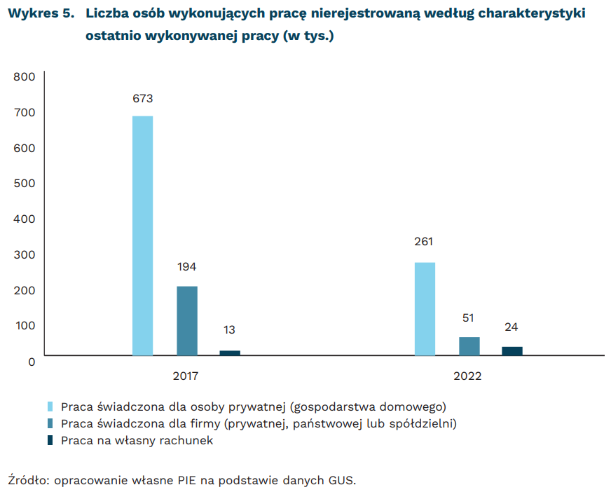 Wśród deklarowanych form pracy nierejestrowanej dominuje praca świadczona dla osób prywatnych. Praca „na czarno” dla firmy jest podejmowana rzadziej. W 2022 r. wykonywało ją 51 tys. osób – to ponad trzykrotny spadek w stosunku do 2017 r. Można wiązać to z poprawiającą się sytuacją gospodarczą i spadkiem bezrobocia oraz tym, że pracownicy bardziej pewni swojej pozycji skuteczniej byli w stanie wynegocjować przysługujące im uprawnienia zalegalizowania stosunku pracy. Analizy pokazały, że – przy porównaniu osób o zbliżonym wykształceniu, wieku i płci pracujących na podobnych stanowiskach – pracownicy niezarejestrowani zarabiają „na rękę” tyle samo co zatrudnieni na podstawie umowy. To oznacza, że przede wszystkim pracodawcy czerpią korzyści finansowe z nierejestrowania pracowników, w których interesie byłoby zalegalizowanie ich zatrudnienia.
