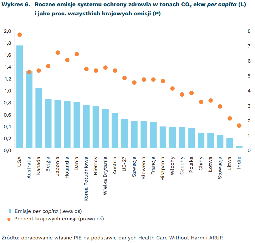 Według analiz Health Care Without Harm, brak działań w kierunku dekarbonizacji sektora ochrony zdrowia spowoduje potrojenie jego emisji w 2050 r. Obecnie najwyższe roczne emisje per capita na ochronę zdrowia można zaobserwować w USA (1,7 tony CO₂ ekw, 7,6 proc. krajowych emisji), Australii (1,3 tony, 5,1 proc.) i Kanadzie (1 tona, 5,2 proc.). W UE-27 średnio jest to ok. 0,5 tony, a w Polsce – 0,34 tony, co stanowi 3,7 proc. krajowych emisji. Kraje UE charakteryzują się także wysokim zróżnicowaniem struktury emisji. 76 proc. emisji polskiego sektora zdrowotnego wytwarzanych jest w kraju, podczas gdy dla Belgii jest to 22 proc., Holandii – 33 proc., Francji – 49 proc., a Niemiec – 61 proc.