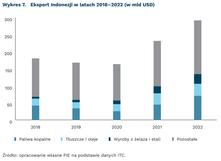 Obszary specjalizacji eksportowej Indonezji utrwalają niekorzystną strukturę jej gospodarki. Za ponad 45 proc. eksportu w 2022 r. odpowiadały paliwa kopalne (HS 27, głównie węgiel: 2. miejsce na świecie), tłuszcze i oleje (HS 15; głównie olej palmowy: 1. miejsce na świecie) oraz wyroby z żelaza i stali (HS 72; głównie stopy żelaza: 1. miejsce na świecie). Wszystkie trzy grupy produktów są związane z wysokimi emisjami gazów cieplarnianych i dużą szkodliwością dla środowiska. W ujęciu zaawansowania technologicznego ponad 50 proc. stanowią dobra niesklasyfikowane ze względu na poziom intensywności czynnika produkcji (artykuły rolne, spożywcze, surowce), zaledwie 16 proc. to low-tech, zaś ok. 19-20 proc. łącznie mid-tech i high-tech. Indonezyjski eksport coraz silniej zależy od Chin, których udział w latach 2013–2022 wzrósł o ponad 10 pkt. proc. do poziomu 22,6 proc.