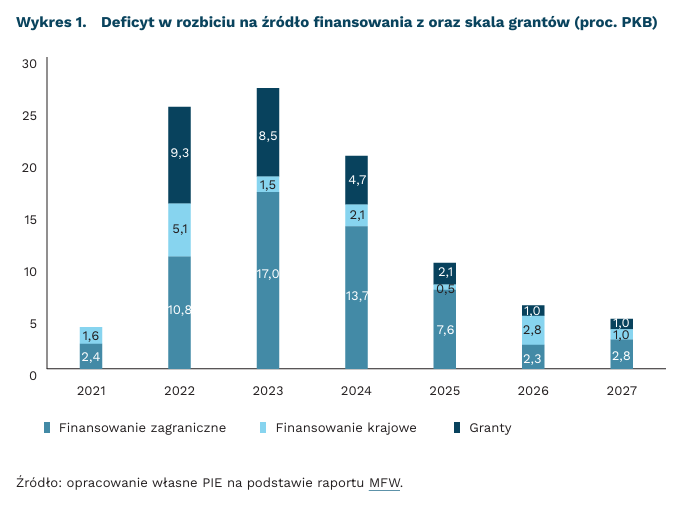 Mimo poprawy aktywności gospodarczej, sytuacja Ukrainy wciąż jest skomplikowana. Głównym źródeł obaw jest zależność od zagranicznego finansowania. MFW wskazuje, że deficyt budżetowy w bieżącym roku wyniesie 15,7 proc. PKB. Wielkość ta ujmuje pomoc bezzwrotną, która obniża go prawie o 5 pkt. proc. Co więcej, finansowanie związanych z nim potrzeb pożyczkowych w znacznym stopniu opiera się na źródłach zewnętrznych. Fundusz szacuje, że 13,7 proc. PKB, czyli niemal 90 proc. całości, pozyskiwane będzie od zewnętrznych pożyczkodawców. To rodzi naturalne ryzyka. Pomoc z USA napotyka coraz większe opory polityczne w Kongresie, które będą eskalować w kampanii prezydenckiej przed listopadowymi wyborami. Ewentualne zwycięstwo D. Trumpa i Republikanów oznacza ograniczenie wsparcia. Ponadto, wznowienie ofensywy ze strony Rosji jest zagrożeniem dla pozostałej części finansowania. Co gorsza, perspektywy na kolejne lata także są mało optymistyczne i wskazują, że do końca 2027 r. deficyt utrzyma się w okolicach 5 proc.