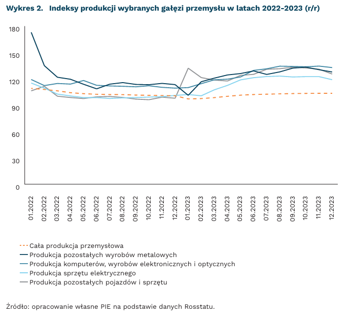 Produkcja gałęzi przemysłu związana z działaniami wojennymi w ubiegłym roku wzrosła o około 1/3 w porównaniu z 2021 r., podczas gdy produkcja w pozostałych gałęziach spadła o 0,4 proc. Od czasu nałożenia sankcji znacznie zmniejszyła się na przykład produkcja samochodów, podobnie jak wielu dóbr konsumpcyjnych wymagających zaawansowanych technologii, które Rosja importowała wcześniej z Zachodu. Produkcja dóbr dla ludności cywilnej została zastąpiona przez wytwarzanie towarów związanych z wojną (np. udział AGD w produkcji elektroniki spadł).