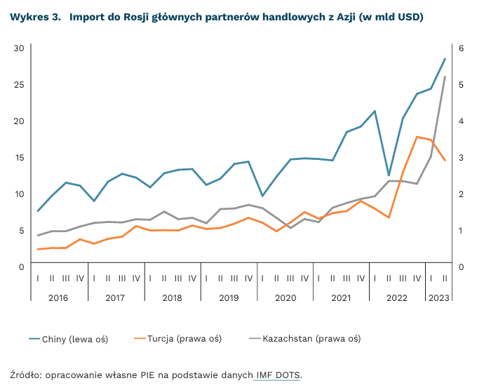 Zachodnie sankcje spowodowały zwiększenie rosyjskich obrotów handlowych z Chinami, Turcją i Kazachstanem. Import do Rosji produktów z Chin osiągnął w II kwartale 2023 r. wartość prawie 30 mld USD i był najwyższy w historii. To wzrost prawie o 100 proc. w porównaniu z analogicznym okresem w 2021 r. Wzrost eksportu do Rosji z Turcji i Kazachstanu był jeszcze wyższy i wyniósł odpowiednio 150 proc. i 200 proc. Główną przyczyną wzrostu importu z tych krajów jest spadek importu z UE, zarówno towarów objętych sankcjami, jak i dopuszczonych do obrotu. Jak wskazuje think thank Ifo Institute, towary objęte zachodnimi sankcjami dostarczają głównie Chiny – w I połowie 2023 r. ich udział w imporcie towarów objętych sankcjami wynosił 57 proc., a wspólny udział krajów WNP i Turcji – 17 proc. Do początku 2024 r. nie zwrócono uwagi na problem eksportu towarów do Rosji przez kraje pośrednie – tylko kilka kirgiskich firm zostało objętych sankcjami.