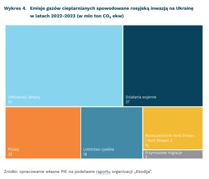Ukraińska organizacja Centrum Inicjatyw Ekologicznych „Ekodija” obliczyła, że rosyjska inwazja na Ukrainę przyczyniła się do emisji 150 mln ton ekwiwalentu CO₂. Głównym składnikiem emisji są koszty klimatyczne przyszłej odbudowy Ukrainy, które autorzy opracowania szacują na 55 mln ton. Działania wojenne spowodowały emisję 37 mln ton, pożary 22 mln ton. Istotne znaczenie dla klimatu miała także emisja metanu, spowodowana rozszczelnieniem gazociągów Nord Stream i Nord Stream 2, której skutki są szacowane na 16 mln ton ekwiwalentu CO₂. Każdy rosyjski i ukraiński żołnierz, zaangażowany w działanie, przyczynia się do emisji dodatkowych 13 ton ekwiwalentu CO₂ rocznie – szacuje brytyjska organizacja pozarządowa Obserwatorium Konfliktów i Środowiska.