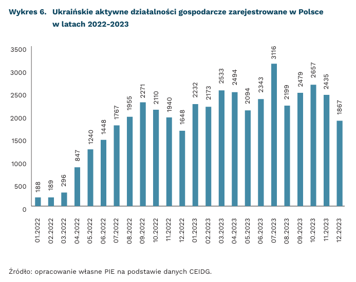 Od stycznia 2022 r. do grudnia 2023 r. działalność gospodarczą w Polsce rozpoczęło ponad 44,5 tys. ukraińskich firm – wynika z danych Centralnej Ewidencji i Informacji o Działalności Gospodarczej (CEIDG). W 2023 r. powstało ok. 28,6 tys. ukraińskich aktywnych jednoosobowych działalności gospodarczych (JDG), tj. 1,8 razy więcej niż przez cały 2022 r. W 2023 r. niemal co dziesiąta nowa firma w Polsce była zakładana przez obywatela z Ukrainy (9,4 proc.). Blisko 3/4 aktywnych działalności rejestrowanych w Polsce przez cudzoziemców prowadzili Ukraińcy (72 proc.).