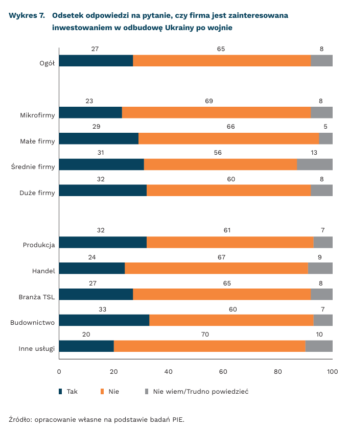 Zainteresowanie inwestowaniem w odbudowę Ukrainy po wojnie zgłasza 27 proc. firm. Udział w odbudowie Ukrainy chciałyby wziąć przede wszystkim duże podmioty. Chęć taką zgłasza 32 proc. dużych firm, 31 proc. średnich, 29 proc. małych firm oraz tylko 23 proc. mikrofirm. Największe zainteresowanie odbudową Ukrainy zgłaszają firmy budowlane (33 proc.) oraz produkcyjne (32 proc.). Na kolejnych miejscach są przedsiębiorcy z branży TSL (27 proc) oraz handlowi (24 proc.). Warto dodać, że w zależności od branży, planów inwestowania w powojenną odbudowę Ukrainy nie ma od 61 proc. do 70 proc. przedsiębiorców.
