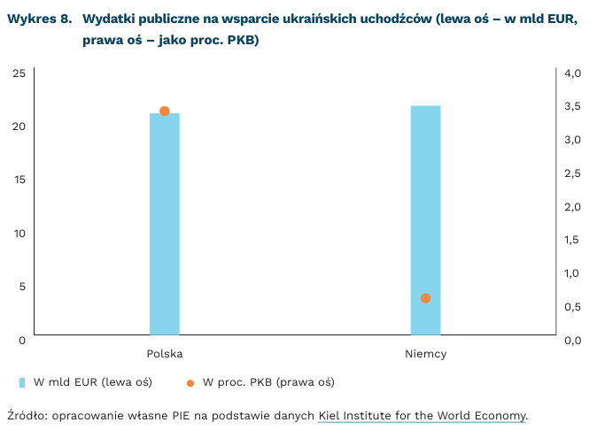 Polska jest jednym z krajów, które poniosły najwyższe koszty wsparcia ukraińskich uchodźców. Pod względem wysokości ogólnych wydatków publicznych związanych z wojną, uwzględniając koszty związane z przyjmowaniem uchodźców, zajmujemy 3. miejsce na świecie, za USA i Niemcami. Kiel Institute for the World Economy szacuje, że koszty poniesione na uchodźców od początku inwazji wynoszą ok. 20,73 mld EUR w Polsce i 21,44 mld EUR w Niemczech. Jednak w Polsce wspomniane wydatki są o wiele wyższe w stosunku do PKB i stanowią 3,35 proc., natomiast w Niemczech 0,55 proc.