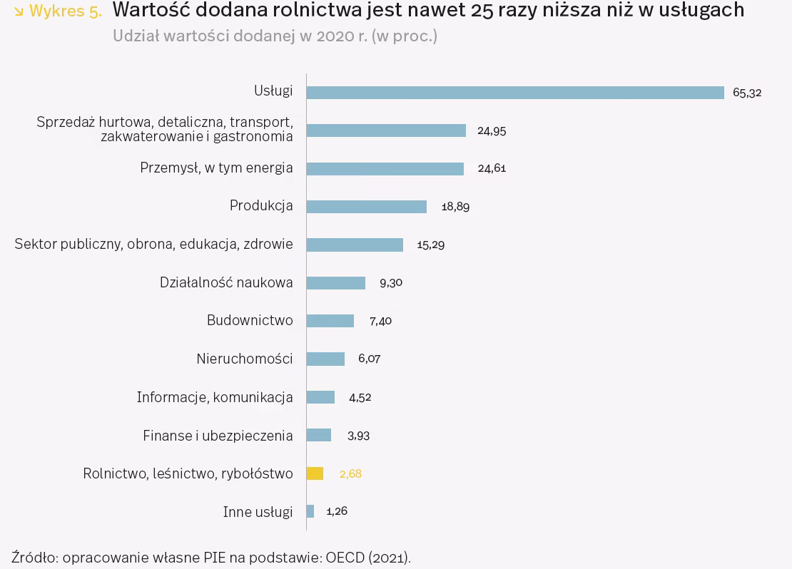 Jednocześnie, liczba gospodarstw rolnych w Polsce zmalała w ciągu ostatniej dekady z 1,5 mln do 1,3 mln, a produktywność sektora wzrosła w okresie 2004-2020 2,3 razy. W 2019 r. wartość dodana wygenerowana w rolnictwie wyniosła 112 mld PLN, jednak według danych OECD, w porównaniu z usługami była aż 25-krotnie niższa – wynika z raportu Polskiego Instytutu Ekonomicznego „Dwie dekady rozwoju polskiego rolnictwa. Innowacyjność sektora rolnego w XXI wieku”.
