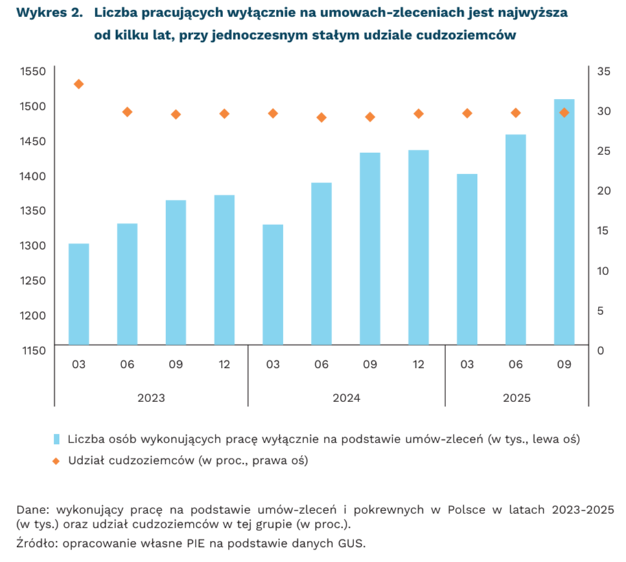 Udział cudzoziemców w grupie pracujących wyłącznie na umowach-zleceniach lub pokrewnych utrzymuje się na podobnym poziomie. Według odczytów GUS za wrzesień 2025 r., cudzoziemcy stanowili 29 proc. wszystkich pracujących wyłącznie na podstawie umów-zleceń lub pokrewnych w Polsce. Struktura ta utrzymuje się na względnie podobnym poziomie od 2023 r. Ogółem, spośród 1,1 mln cudzoziemców wykonujących pracę w Polsce, 437,4 tys. realizowało wyłącznie umowy-zlecenia i pokrewne. Jest to wzrost o 7,4 proc. względem września 2024 r. (o 2 pkt. proc. więcej niż w przypadku ogółu pracujących wyłącznie na tego typu umowach).