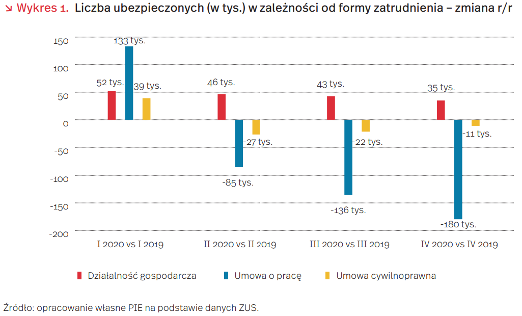 W 2020 r. wzrosła liczba osób prowadzących własną działalność gospodarczą. Jednocześnie wyraźnie spadła liczba osób pracujących na podstawie umowy o pracę i nieznacznie spadła liczba osób pracujących na podstawie umowy cywilnoprawnej. Na wykresie 1 porównujemy zmiany w poziomie zatrudnienia z roku na rok dla poszczególnych kwartałów 2020 r. – takie ujęcie pozwala wyeliminować wahania cykliczne, które pojawią się zwłaszcza w kontekście umów cywilnoprawnych. W I kw. 2020 r. zatrudnienie rok do roku w każdej z tych trzech form rosło. Na skutek kryzysu wywołanego pandemią COVID-19 w II kw. wyraźnie spadła liczba osób zatrudnionych na umowę o pracę. Spadek ten pogłębiał się w kolejnych kwartałach. Od II do IV kw. 2020 r. spadała także liczba osób pracujących na podstawie umów cywilnoprawnych. Tymczasem liczba osób samozatrudnionych rosła także po wybuchu pandemii. W IV kw. 2019 r. ok. 1 mln 595 tys. osób prowadziło własną działalność gospodarczą, w IV kw. 2020 r. było to już ok. 1 mln 630 tys. osób. Oznacza to, że liczba samozatrudnionych wzrosła w 2020 r. o ok. 35 tys.