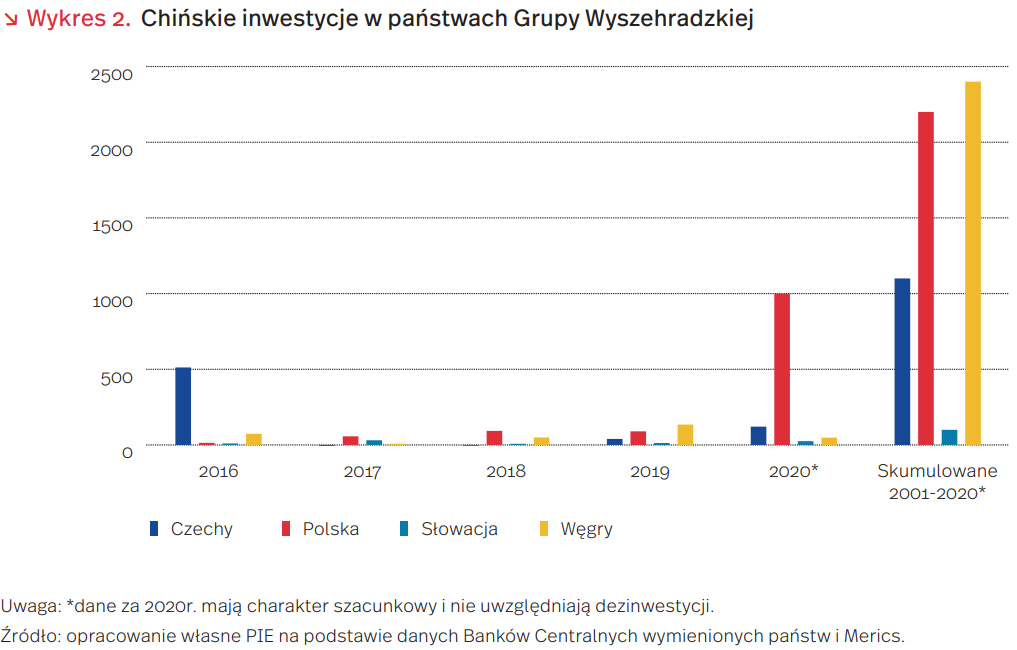 W państwach Grupy Wyszehradzkiej widać z kolei stosunkowo niewielką aktywność chińskich inwestorów. Do 2019 r., największy napływ chińskiego kapitału zanotowały Węgry (2,4 mld USD), a następne w kolejności były odpowiednio: Polska (1,2 mld USD), Czechy (1 mld USD) i Słowacja (0,1 mld USD). Jeszcze mniejsze środki były inwestowane w państwach bałtyckich: na Litwie, Łotwie i Estonii wynosiły poniżej 100 mln USD. W ubiegłym roku większe inwestycje odnotowano jedynie w Polsce, co spowodowało, że ich łączna wartość staje się porównywalna z wartościami na Węgrzech, w którym to kraju Huawei i Wanhua poczyniły znaczne inwestycje jeszcze przed 2010 r.