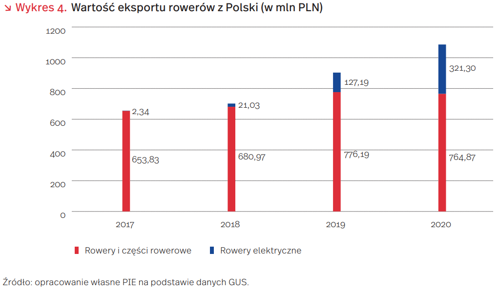 Eksport rowerów rośnie szybciej niż polski eksport towarów ogółem, choć obecnie nie odgrywa w nim istotnej roli. W 2020 r. eksport przekroczył 1 mld PLN, o 20 proc. więcej niż w 2019 r., lecz stanowił zaledwie 0,1 proc. łącznego polskiego wywozu towarów. Warto jednak odnotować, że rośnie znaczenie nowej kategorii – rowerów z silnikiem elektrycznym. Zgodnie z badaniem MTB, rowery elektryczne jak dotąd ma ok. 2,2 proc. respondentów w Polsce, a 10,7 proc. z nich deklaruje chęć zakupu. Ich eksport wzrósł od 2018 r. (kiedy nałożono antydumpingowe cła na produkty z Chin) 15-krotnie, a w porównaniu z 2019 r. – 2,5-krotnie i osiągnął wartość 321 mln PLN, odpowiadając niemal za jedną trzecią wywozu wszystkich rowerów. W UE Polska jest 6. najważniejszym dostawcą rowerów do innych państw członkowskich i 9. w kategorii rowerów elektrycznych. Najważniejszym odbiorcą polskich rowerów są Niemcy, które odpowiadają za 45 proc. wywozu, oraz Czechy z 13-proc. udziałem.